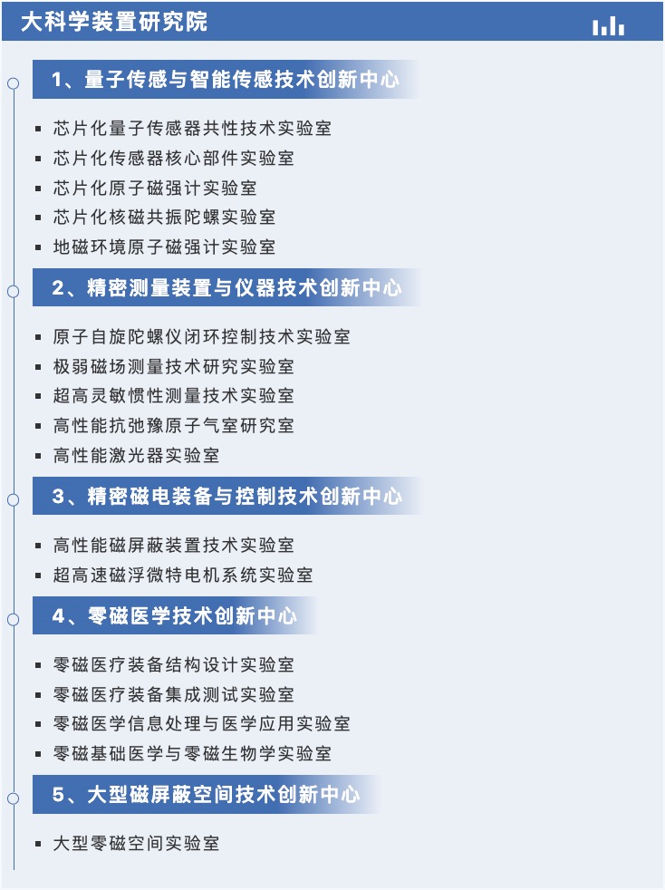 大装置院现有量子传感与智能传感、量子精密测量装置与仪器、精密磁电装备与控制技术、零磁医学、大型磁屏蔽空间等五个技术创新中心。在承担国家重大科技基础设施建设任务的同时,依托大设施开展重大科学问题研究、重要核心技术攻关和成果转化。面向世界科技前沿和国家重大战略需求,开展超高灵敏极弱磁场与惯性测量装置的研制,为神经科学与脑科学、基础物理学等前沿研究提供有效手段,同时服务空间探测和计量测试。面向人民生命健康和经济主战场,开展芯片级量子传感器技术和高分辨率极弱磁场人体功能成像技术研究,推动高精度量子传感器的产业化,实现高端医疗设备的原始创新。依托大设施,开展零磁医学、零磁生物学、零磁化学、零磁物理学和零磁材料学的前沿基础科学研究,发起国际零磁大科学计划。