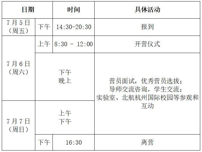 2.报到地点:白马湖建国饭店;夏令营地点:滨江区长河街道炬航弄99号北航杭州创新研究院。白马湖建国饭店到北航杭州创新研究院有专车接送。